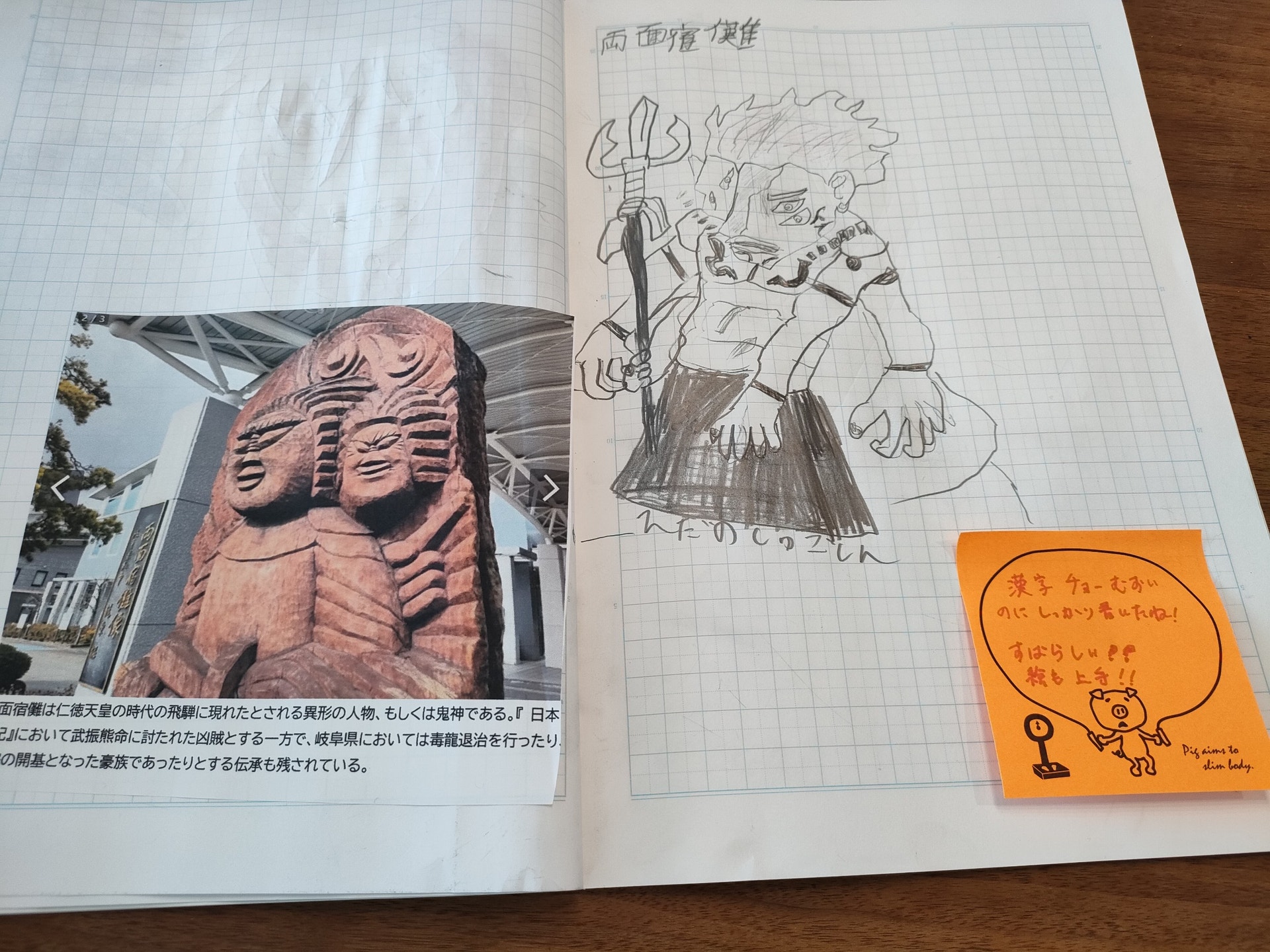 天才ノートに呪術廻戦の絵を描き出した。アニメを詳しく知らない私にキャラクターを教えてくれた。私は聞いてもサッパリ分からないが…。